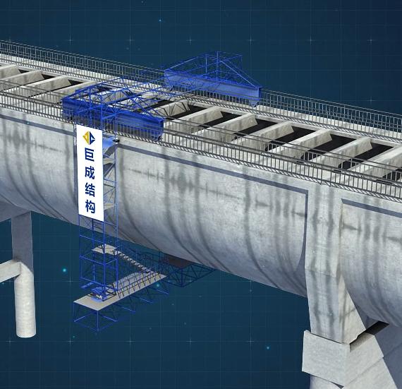在橋梁檢修架車的基礎上,巨成結構研究開發了渡槽專用檢修架車,該渡槽檢修車結構輕巧,安裝使用方便,不占用渡槽下部空間,摒棄了傳統的搭設、拆除滿堂腳手架等繁重且危險程度高的工作。該種檢修架車可沿渡槽縱向行走,豎直方向通過可伸縮式垂直桁架調節施工和檢修高度;同時工作平臺為可回轉式設計,遇到槽墩等障礙物時可快速進行回轉運動,檢修架車便能連續行走作業;側向限位裝置保證了檢修架車在行進過程中的安全性。